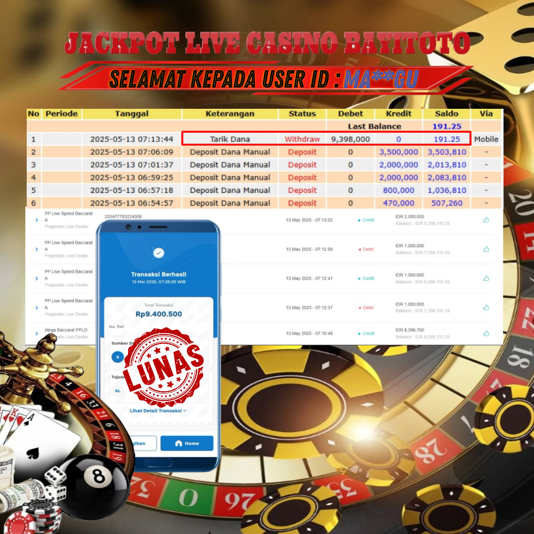 Selamat kepada User id : Mar*****k Telah berhasil mendapatkan kemenangan besar p