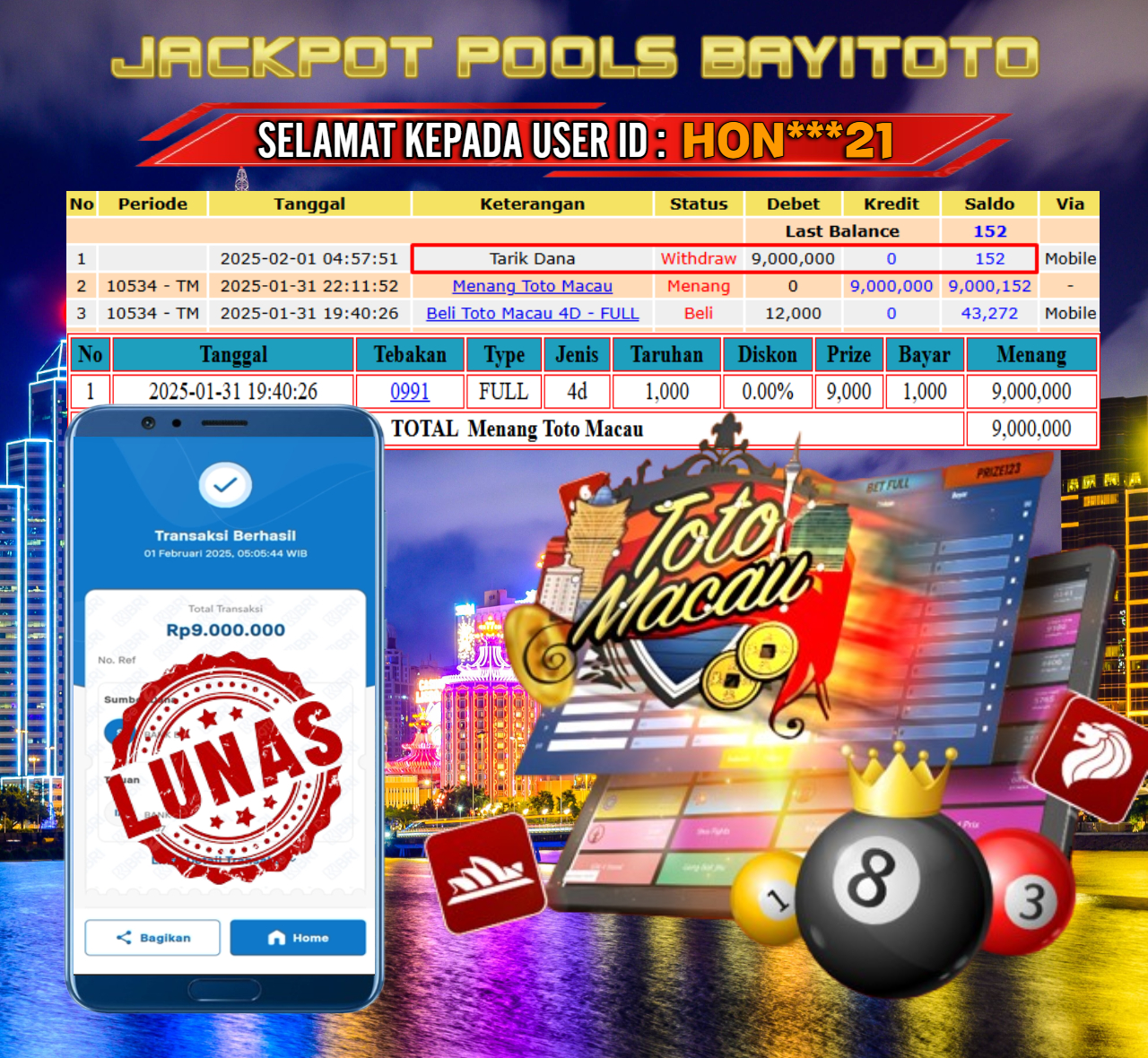 Selamat kepada User id : HON***21 Telah berhasil mendapatkan kemenangan besar pa