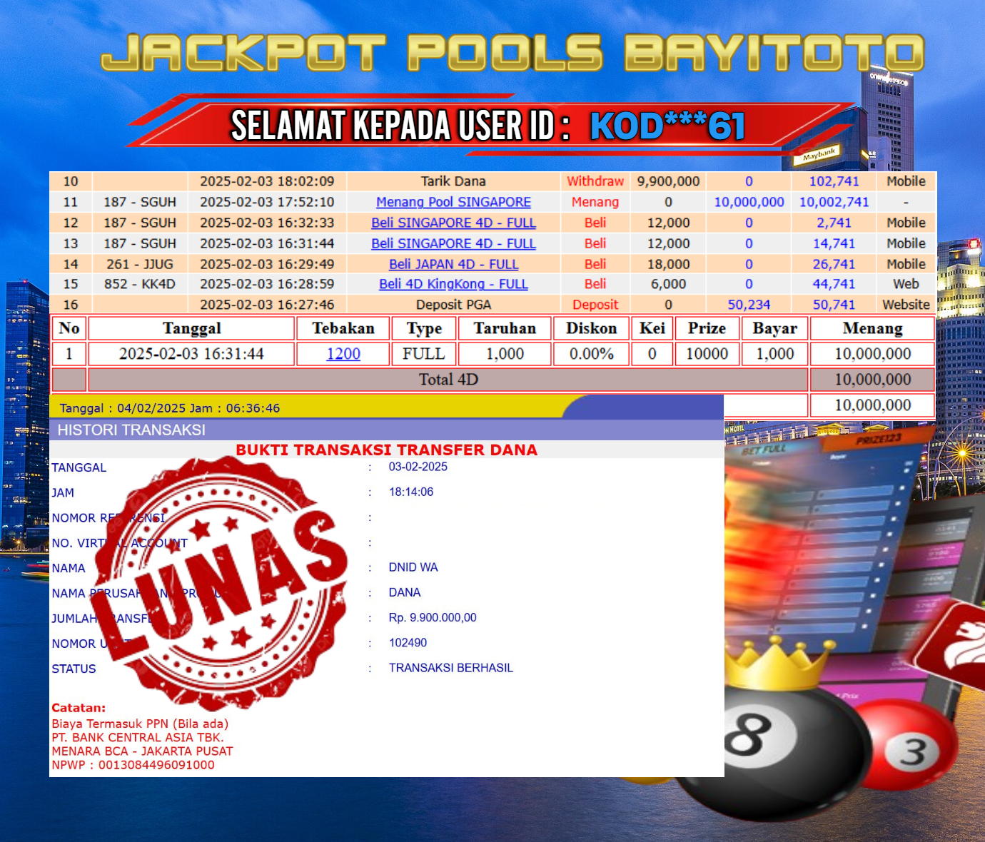 Selamat kepada User id : NAD***11 Telah berhasil mendapatkan kemenangan besar pa